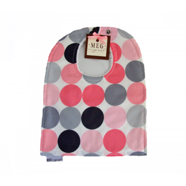 Keep them clean and make a fashion statement at the same time! This stylishly reversible functional bib is fun pink & grey disco dot. Measurements are 9x12 inches. 100% cotton.Backed with soft & absorbent chenille.Each bib has 2 antique bronze snaps for adjustability.Top stitched for quality and durability. Coordinates to matching blanket, changing pad, & burp clothes.Machine wash, Tumble Dry.